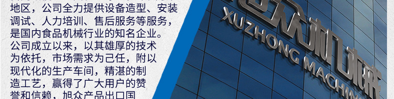 廣州旭眾食品機(jī)械有限公司是一家集科研開(kāi)發(fā),生產(chǎn)設(shè)計(jì),營(yíng)銷服務(wù)為一體的現(xiàn)代化生產(chǎn)企業(yè)?,F(xiàn)代化生產(chǎn)車間,精湛制造技術(shù),所產(chǎn)機(jī)械歷經(jīng)市場(chǎng)重重考驗(yàn),不斷贏得海內(nèi)外客戶的贊譽(yù)。
