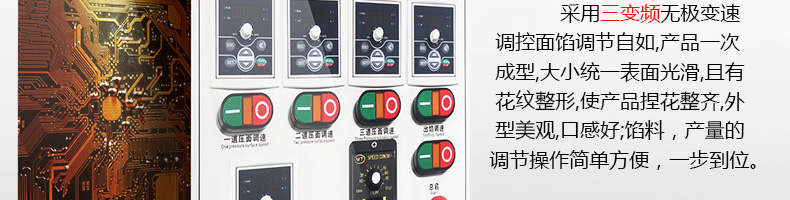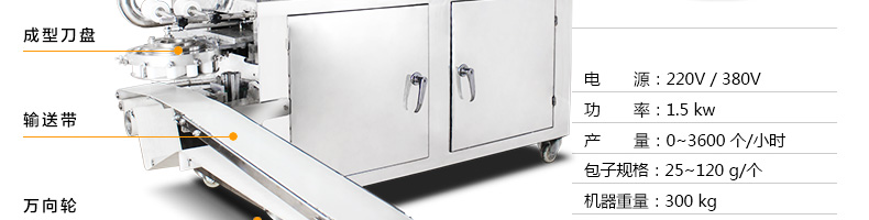 名稱290III卷面式包子機 電源220/380V(見機器名牌) 功率2.4kw 產量0-3600個/小時 尺寸2050*1470*1480mm(包括輸送帶) 重量400kg 規(guī)格25-130克/個 其他
