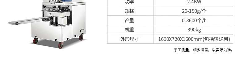 名稱旭眾30單餡斗包子機 電源220/380V(見機器名牌) 功率2.5kw 產(chǎn)量0-1800個/小時 尺寸1440*680*1420mm(包括輸送帶) 重量300KG 規(guī)格20-100克/個 其他