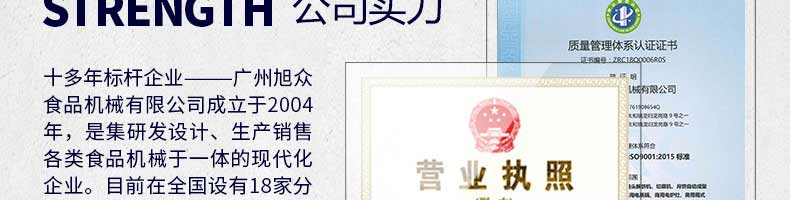 廣州旭眾食品機械有限公司是一家集科研開發(fā),生產(chǎn)設(shè)計,營銷服務(wù)為一體的現(xiàn)代化生產(chǎn)企業(yè)?,F(xiàn)代化生產(chǎn)車間,精湛制造技術(shù),所產(chǎn)機械歷經(jīng)市場重重考驗,不斷贏得海內(nèi)外客戶的贊譽。