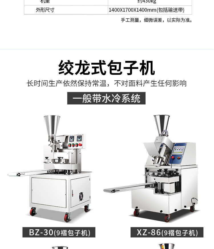名稱XZ-190智能型卷面式包子機(jī) 電源220/380V(見機(jī)器銘牌) 功率2.22KW 產(chǎn)量0-3600個/h 尺寸1400X1700X1400mm(包括輸送帶) 重量約430kg 規(guī)格聯(lián)系銷售員 其他