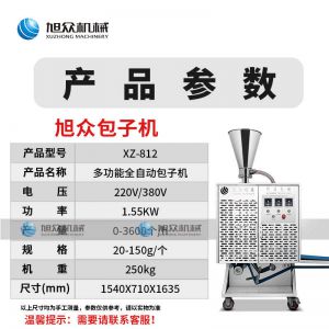 名稱XZ-B812型多功能包子機(jī) 電源220V/380V 功率1.55KW 產(chǎn)量0-3600個(gè)/h 尺寸1540×710×1635mm 重量250kg 規(guī)格25-130g/個(gè) 其他