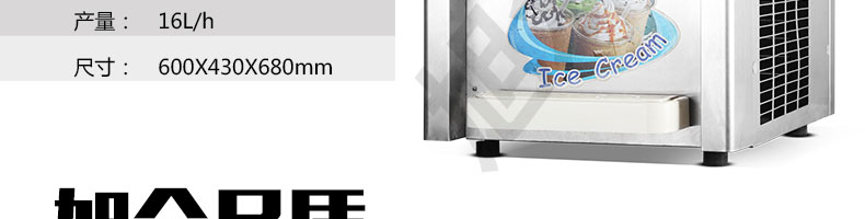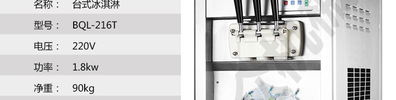 名稱BQL-216T臺式冰淇淋機 電源220V 功率1.8kw 產量16L/h 尺寸600*430*680mm 重量92kg 規(guī)格 其他