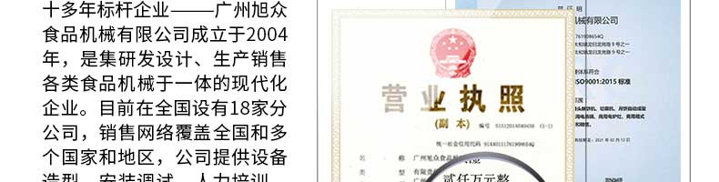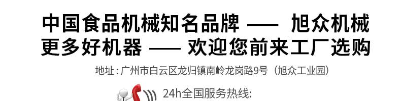 廣州旭眾食品機械有限公司是一家集科研開發(fā),生產設計,營銷服務為一體的現(xiàn)代化生產企業(yè)。現(xiàn)代化生產車間,精湛制造技術,所產機械歷經(jīng)市場重重考驗,不斷贏得海內外客戶的贊譽。