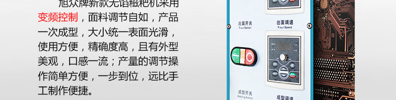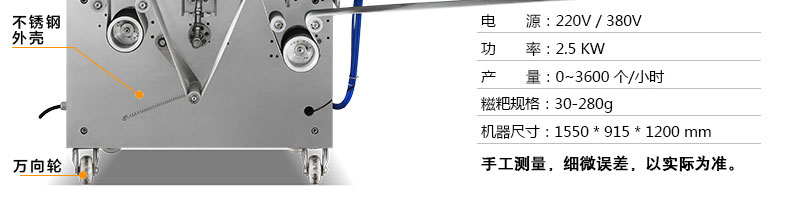 名稱XZ-5000A糍粑機(jī) 電源220/380V(見機(jī)器名牌) 功率2.5kw 產(chǎn)量0-5200個(gè)/小時(shí) 尺寸1550*980*1300mm 重量280kg 規(guī)格20-180克/個(gè) 其他