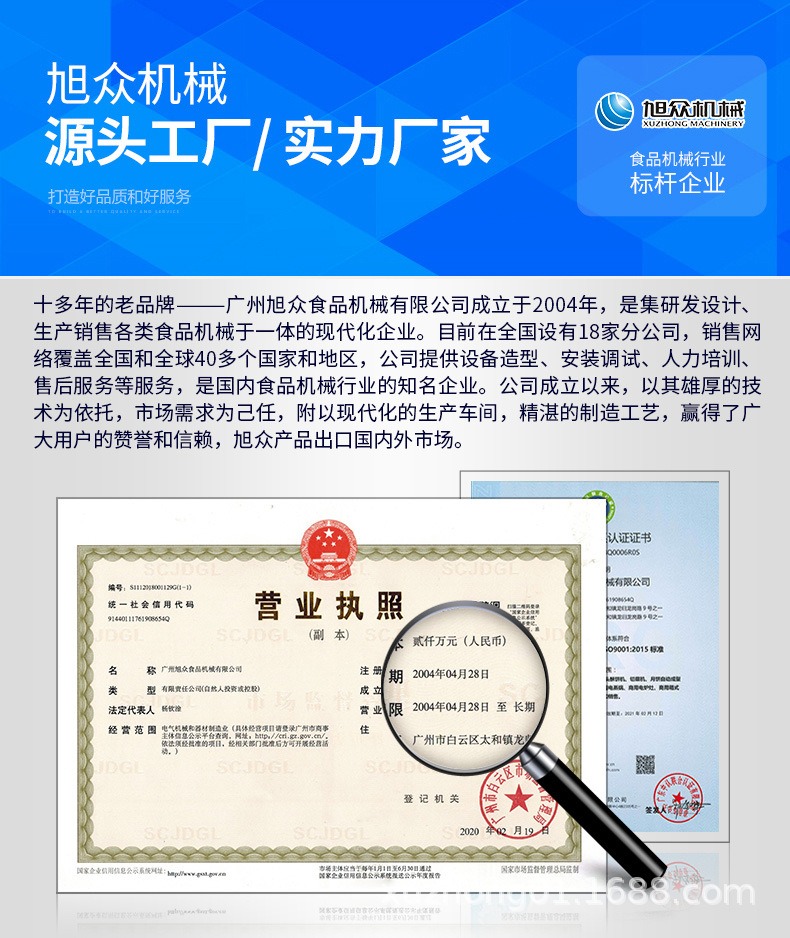 廣州旭眾食品機械有限公司是一家集科研開發(fā),生產(chǎn)設(shè)計,營銷服務(wù)為一體的現(xiàn)代化生產(chǎn)企業(yè)?,F(xiàn)代化生產(chǎn)車間,精湛制造技術(shù),所產(chǎn)機械歷經(jīng)市場重重考驗,不斷贏得海內(nèi)外客戶的贊譽。