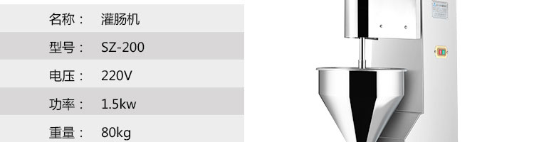 名稱SZ-200灌腸機(jī) 電源220/380V(見機(jī)器銘牌) 功率1.14-1.5kw 產(chǎn)量200千克/小時(shí) 尺寸520*390*1320mm 重量80kg 規(guī)格 其他