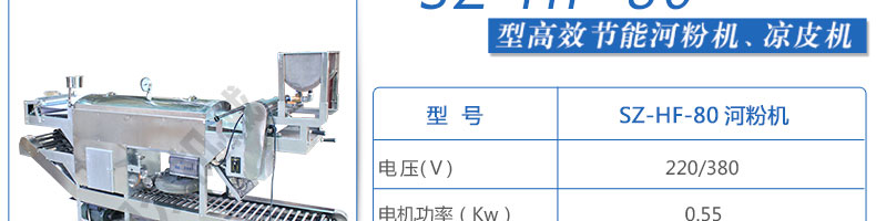 名稱SZ-HF-80高效節(jié)能河粉機 電源220/380V 功率0.75/22kw 產(chǎn)量24/36/48/60kg/h 尺寸主機尺寸2700*500*1050mm 外形尺寸2800*700*1500mm 重量220kg 規(guī)格粉條寬度mm:4/6/8/10 其他