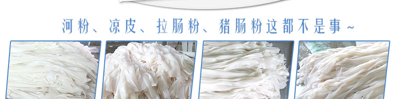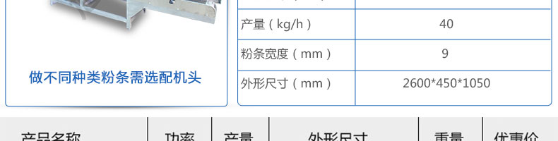 名稱(chēng)SZ-HF-40涼皮機(jī) 電源220/380V 功率0.75/19kw 產(chǎn)量16/24/32/40kg/h 尺寸主機(jī)尺寸2600*450*1050mm 外形尺寸2700*650*1500mm 重量200kg 規(guī)格粉條寬度mm:4/6/8/10 其他
