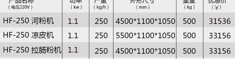 名稱SZ-HF-250涼皮機 電源220/380V 功率1.1/81kw 產(chǎn)量100/150/200/250kg/h 尺寸主機尺寸5500*1000*1050mm 外形尺寸5600*1200*1500mm 重量500kg 規(guī)格粉條寬度mm:4/6/8/10 其他