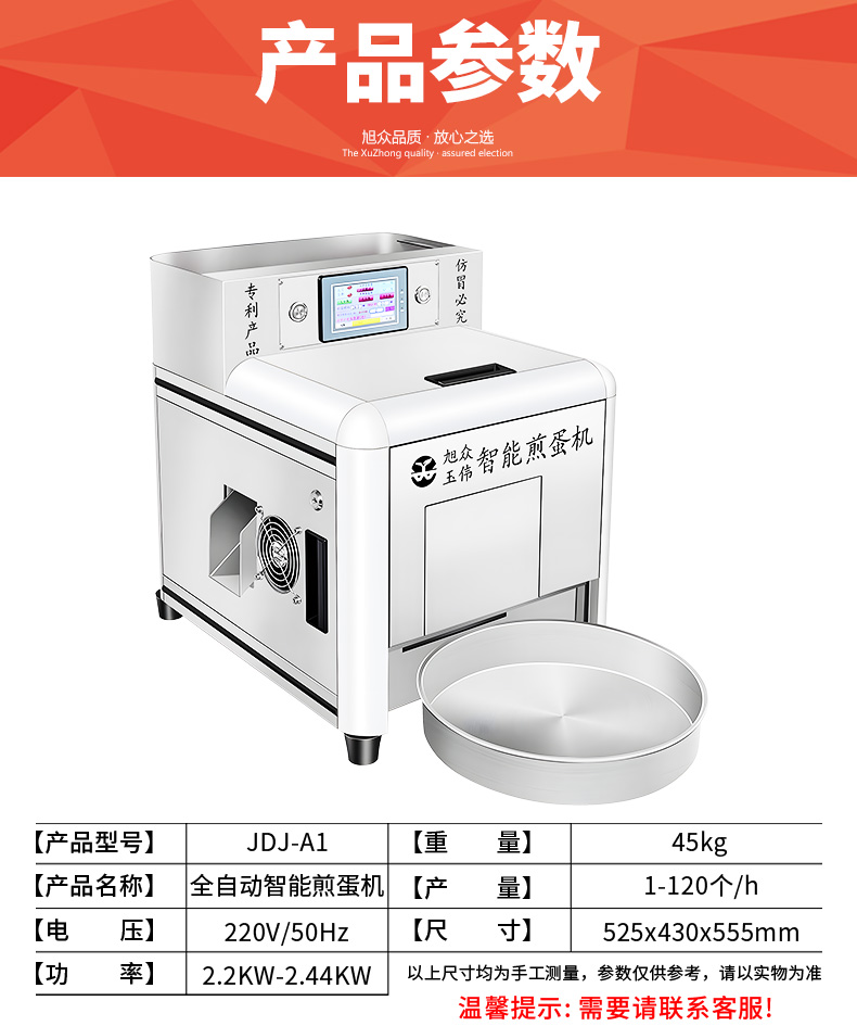 名稱商用全自動(dòng)智能煎蛋機(jī) 電源220V/50Hz 功率2.2KW-2.44KW 產(chǎn)量1-120個(gè)/h 尺寸525x430x555mm 重量45kg 規(guī)格 其他