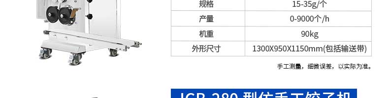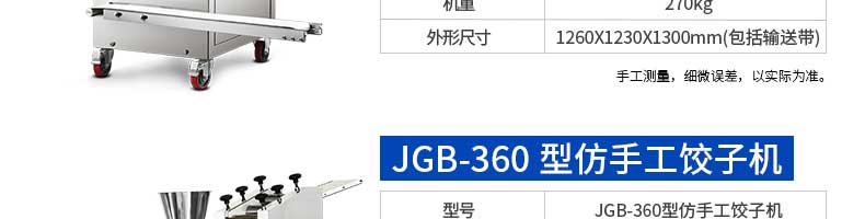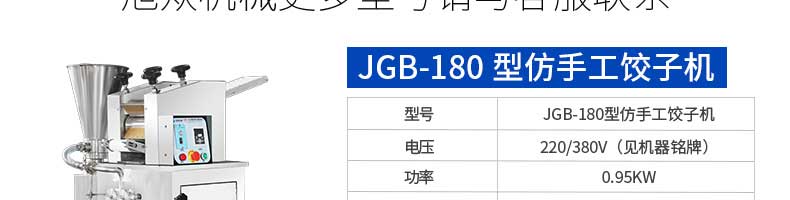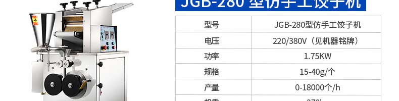 名稱JGB-210B仿手工餃子機(jī) 電源220/380v 功率1.75kw 產(chǎn)量0-20000個(gè)/h 尺寸1760*760*1300mm 重量330kg 規(guī)格15-35g/個(gè) 其他
