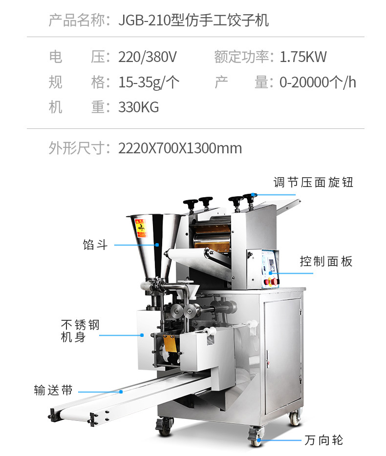 JGB-210型仿手工餃子機(jī),本機(jī)采用自動(dòng)壓面皮包餃子的新工藝技術(shù),本機(jī)可生產(chǎn)速凍餃子等,能生產(chǎn)各種肉餡、肉菜混合餡、全菜餡及其他種餡的餃子,適用于餃子館、食品生產(chǎn)廠家、賓館、飯店、餐廳、團(tuán)體食堂、學(xué)校、部隊(duì)。免費(fèi)上門(mén)安裝調(diào)試,贈(zèng)送面點(diǎn)工藝
