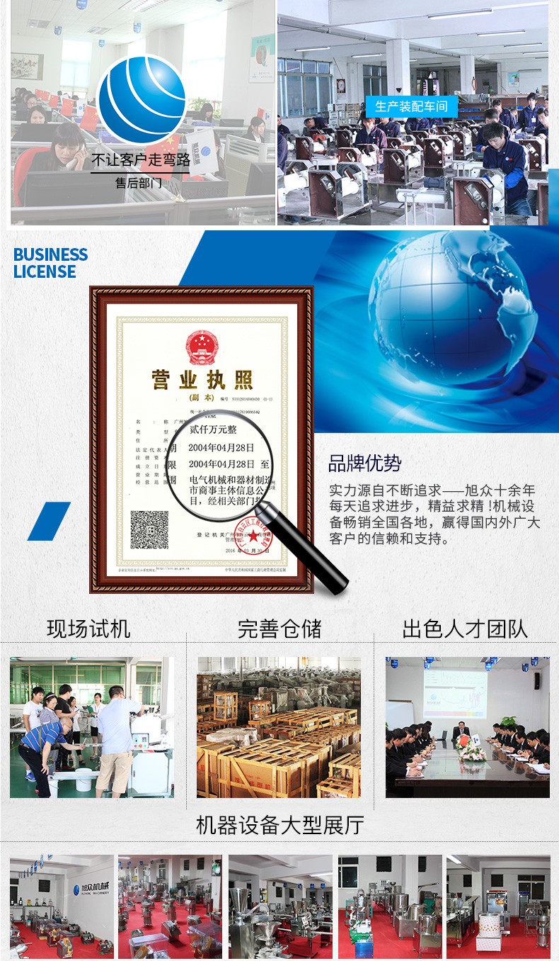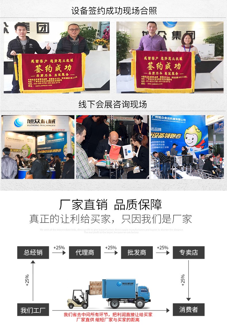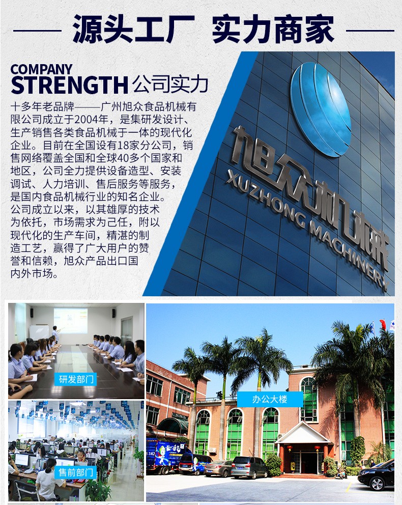 廣州旭眾食品機(jī)械有限公司是一家集科研開(kāi)發(fā),生產(chǎn)設(shè)計(jì),營(yíng)銷服務(wù)為一體的現(xiàn)代化生產(chǎn)企業(yè)?,F(xiàn)代化生產(chǎn)車間,精湛制造技術(shù),所產(chǎn)機(jī)械歷經(jīng)市場(chǎng)重重考驗(yàn),不斷贏得海內(nèi)外客戶的贊譽(yù)。