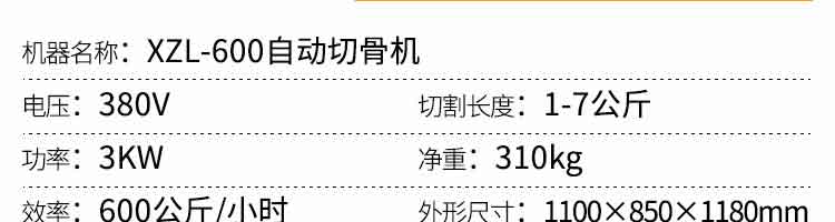 名稱XZL-600切骨機(jī) 電源380V 功率3kw 產(chǎn)量600公斤/小時(shí) 尺寸1100*850*1180MM 重量310kg 規(guī)格 其他