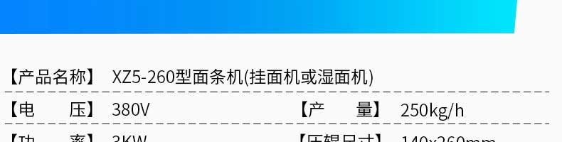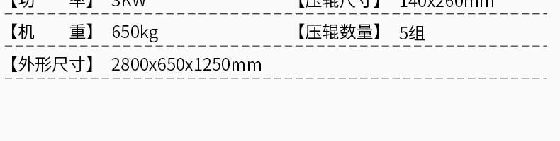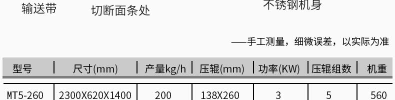 名稱MT5-260型面條機(jī) 電源380V 功率3KW 產(chǎn)量250kg/h 尺寸2800X650×1250mm 重量650kg 規(guī)格【壓輥尺寸】140X260mr 其他【壓輥數(shù)量】5組