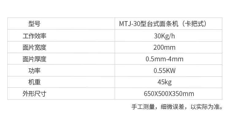 名稱MTJ-30型臺(tái)式面條機(jī)(卡把式) 電源 功率0.55KW 產(chǎn)量30kg/h 尺寸650X500X350mm 重量45k 規(guī)格面片寬度200mm面片厚度0.5mm-4mm 其他