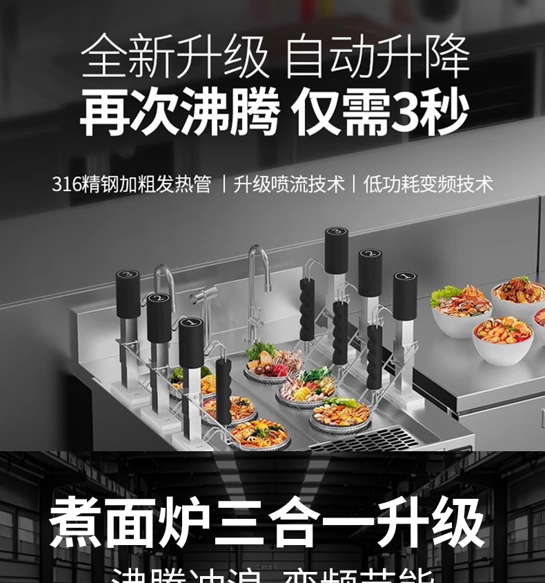 三合一煮面爐,全新升級,自動升降再次沸騰,僅需3秒。316精鋼加粗發(fā)熱管、升級噴流技術、低功耗變頻技術。煮面爐三合一升級,沸騰沖浪、變頻節(jié)能。