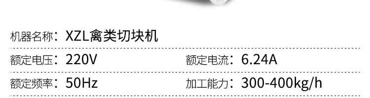 名稱(chēng)XZL禽類(lèi)切塊機(jī) 電源220V 功率1100W 產(chǎn)量300-400kg/H 尺寸 重量80kg 規(guī)格 其他