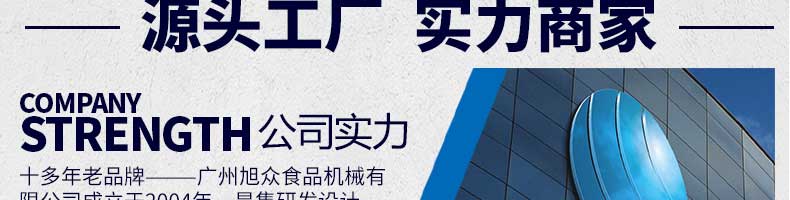 廣州旭眾食品機(jī)械有限公司是一家集科研開發(fā),生產(chǎn)設(shè)計,營銷服務(wù)為一體的現(xiàn)代化生產(chǎn)企業(yè)。現(xiàn)代化生產(chǎn)車間,精湛制造技術(shù),所產(chǎn)機(jī)械歷經(jīng)市場重重考驗,不斷贏得海內(nèi)外客戶的贊譽(yù)。