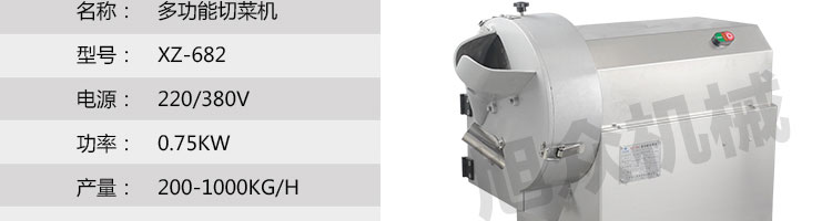 名稱XZ-682多功能切菜機 電源220/380V(見機器銘牌) 功率0.75kw 產(chǎn)量200-1000千克/小時 尺寸770*460*800mm 重量140kg 規(guī)格標配刀具尺寸:切絲:3mm,切片:3mm,切?。?0*10mm??蛇x的刀具尺寸:切絲:4、5、6mm 其他