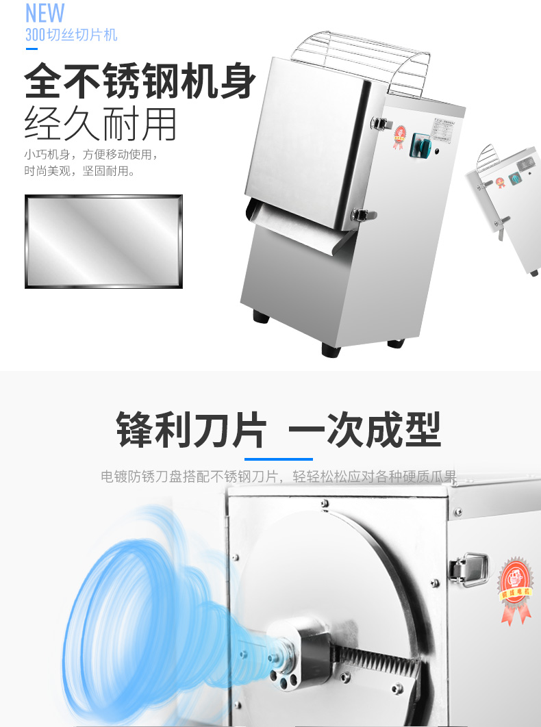 300型瓜果切絲切片機(jī),高效便捷、一次成型、每小時可切200-300KG。全不銹鋼機(jī)身經(jīng)久耐用小巧機(jī)身,方便移動使用,時尚美觀,堅固耐用。鋒利刀片、一次成型。電鍍防銹刀盤搭配不銹鋼刀片,輕輕松松應(yīng)對各種硬質(zhì)瓜果。