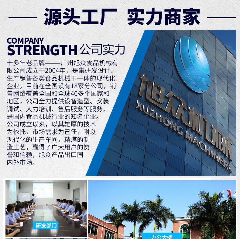 廣州旭眾食品機(jī)械有限公司是一家集科研開發(fā),生產(chǎn)設(shè)計,營銷服務(wù)為一體的現(xiàn)代化生產(chǎn)企業(yè)。現(xiàn)代化生產(chǎn)車間,精湛制造技術(shù),所產(chǎn)機(jī)械歷經(jīng)市場重重考驗,不斷贏得海內(nèi)外客戶的贊譽(yù)。