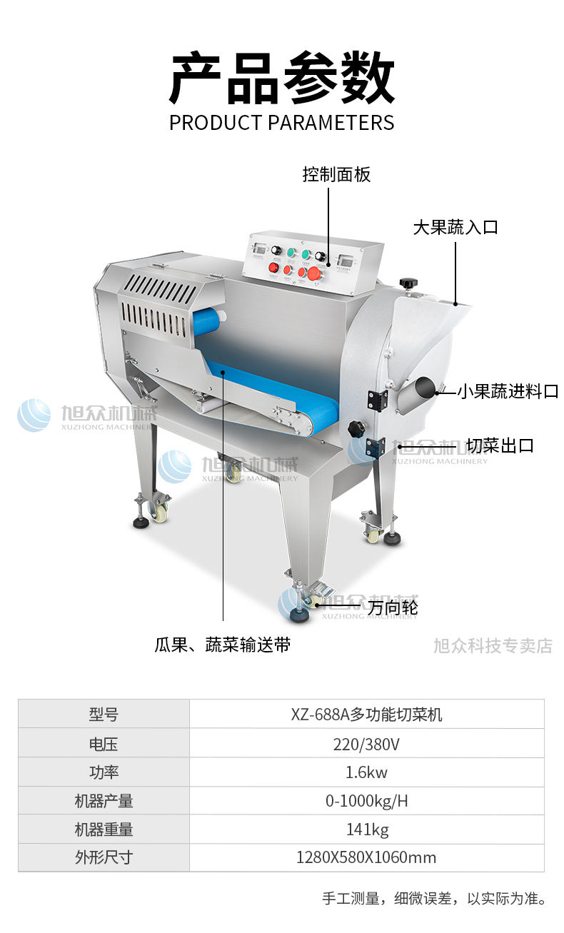 XZ-688A切菜機(jī),占地使用面積小機(jī)器小,省空間,適合飯店、食堂、酒店等使用。省事省力省人工1小時(shí)加工2000斤葉菜切刀速度為1104轉(zhuǎn)/分,切絲、切片、切丁、刀速371轉(zhuǎn)/分。