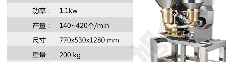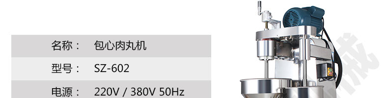 名稱SZ-602包心肉丸機 電源220/380V(見機器銘牌) 功率1.1kw 產量140-420個/分鐘 尺寸770*530*1280mm 重量200kg 規(guī)格 其他