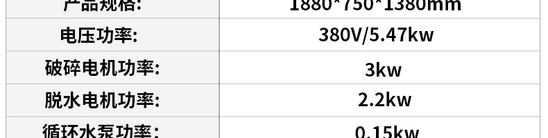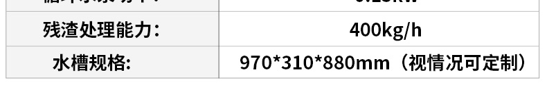 名稱廚房垃圾處理器 電源380v 功率547kW 產(chǎn)量殘?jiān)幚砟芰?400kg/h 尺寸1880*750*1380mm 重量請(qǐng)咨詢銷售員 規(guī)格水槽規(guī)格:970*310*880mm(視情況可定制) 其他破碎電機(jī)功率:3kW,脫水電機(jī)功率:2.2kW,循環(huán)水泵功率:0.15kW