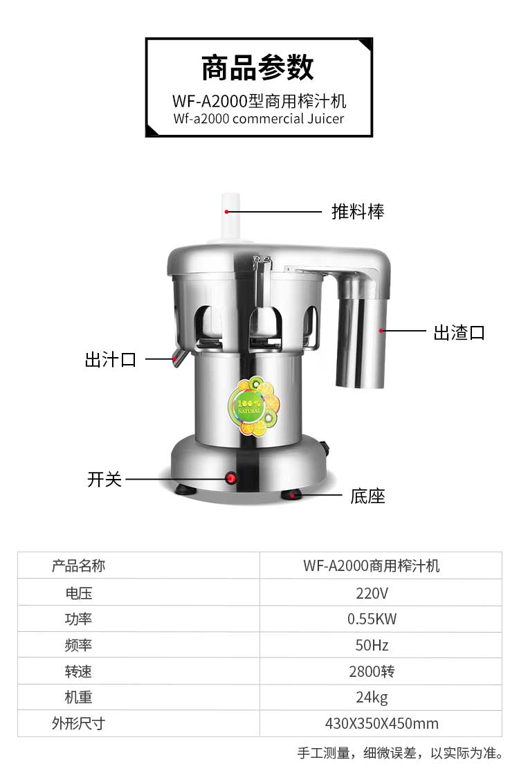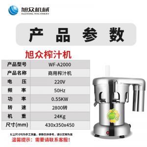 名稱WF-A2000商用榨汁機(jī) 電源220V 功率0.55kw 產(chǎn)量轉(zhuǎn)速:2800r/min 尺寸430*350*450mm 重量26kg 規(guī)格 其他