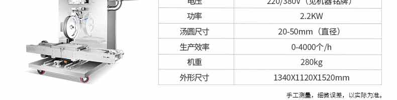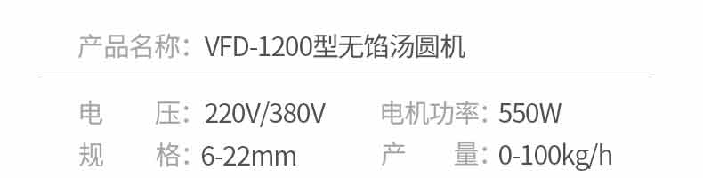 名稱VFD-1200無餡湯圓機(jī) 電源220/380V 功率0.55KW 產(chǎn)量50-100kg/h 尺寸1350*900*850mm 重量220kg 規(guī)格 其他