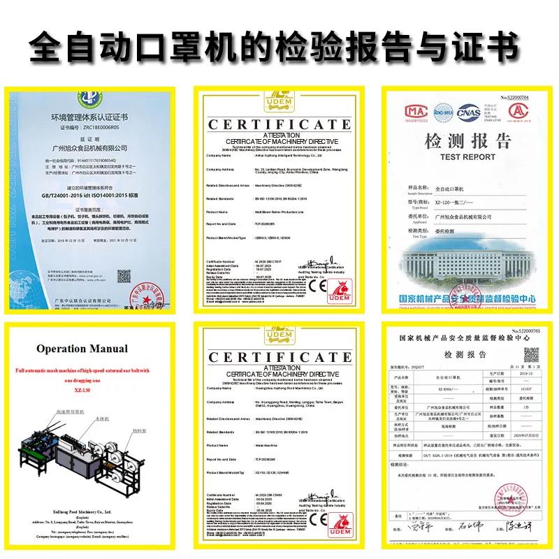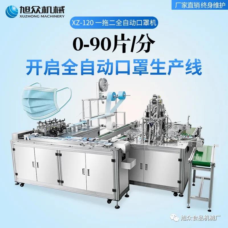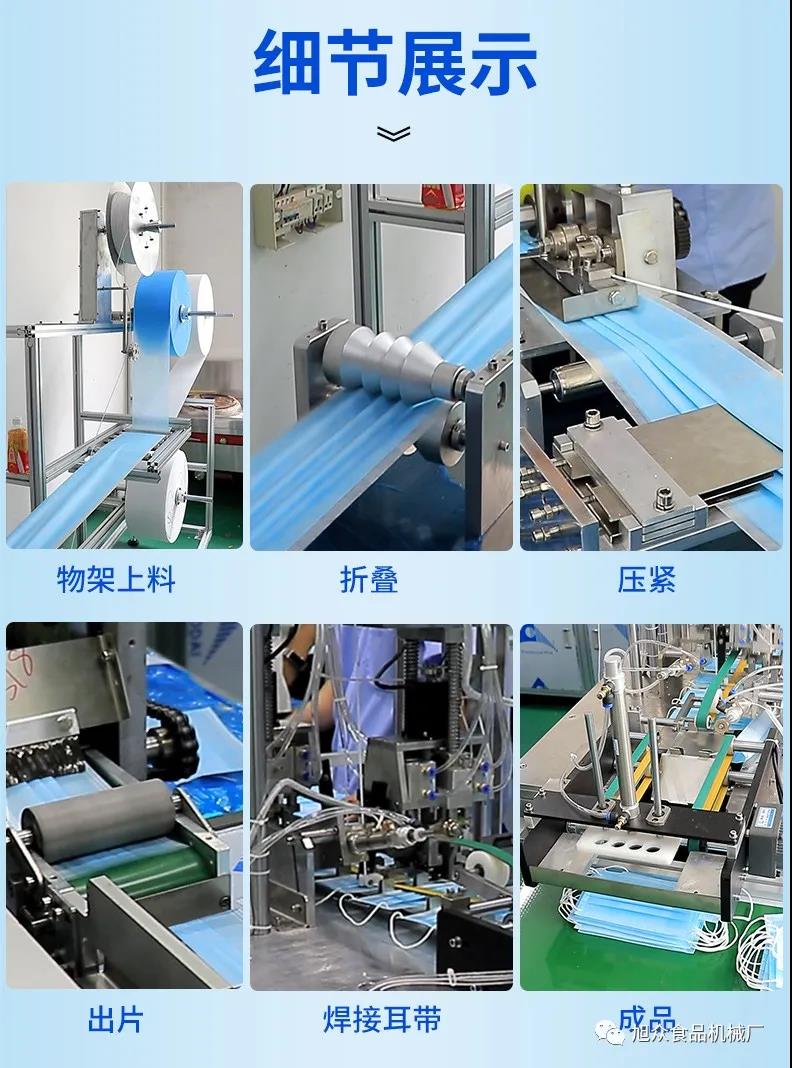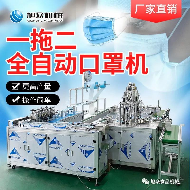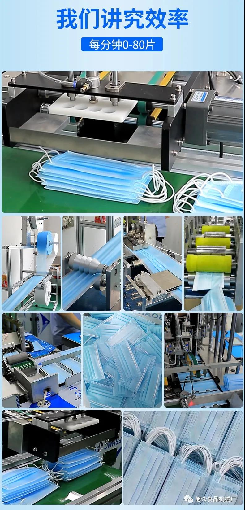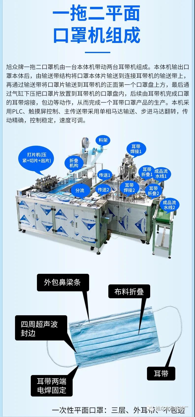 旭眾牌一拖二口罩機由一臺本體機帶動兩臺耳帶機組成。本體機輸出ロ罩本體后,由輸送帶結(jié)構(gòu)將口罩本體片輸送到連接耳帶機的輸送帶上,再通過輸送帶將口罩片輸送到耳帶機的正面第一個口罩盤上方,最后通過氣缸下壓把口罩片放置到耳帶機的口罩盤內(nèi),后續(xù)由耳帶機完成口罩的耳帶熔接,包邊等動作,從而完成一個耳帶口罩產(chǎn)品的生產(chǎn)。本機采用PLC、觸摸屏控制、主傳送帶采用單相馬達輸送、步進馬達翻轉(zhuǎn),傳動精確,控制穩(wěn)定,速度可調(diào)。