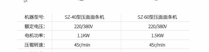 名稱sz系列-壓面面條機 電源220/380V 功率1.1KW,1.5KW 產(chǎn)量40-50KG,50-60KG 尺寸580*370*1000mm,450*400*860mm 重量75KG,85kg 規(guī)格 其他