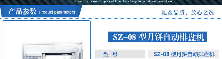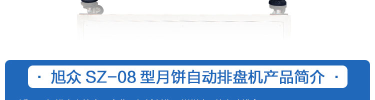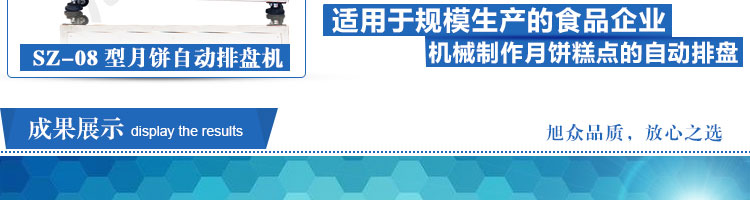 SZ-08型月餅自動(dòng)排盤機(jī),可同于制作各種月餅。適用于蛋糕房、休閑食品廠、食品加工產(chǎn)、面包房、月餅加工廠、超市、學(xué)校、食堂等各種工作場(chǎng)所。可滿足不同客戶群體。免費(fèi)提供工藝技術(shù)。