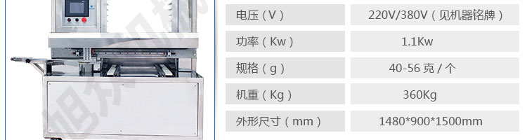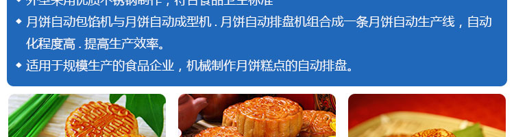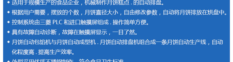 名稱SZ-08型月餅自動(dòng)排盤機(jī) 電源220V 功率1.1kw 產(chǎn)量30-100個(gè)/分鐘 尺寸外形尺寸1320*1000*1120mm,裝上輸送架尺寸1320*1820*1230mm 重量360kg 規(guī)格10-200克/個(gè) 其他