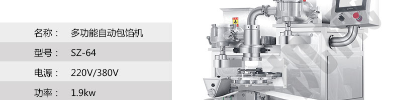 名稱SZ-64多功能自動(dòng)包餡機(jī) 電源220/380V 功率1.9kw 產(chǎn)量30-80個(gè)/分鐘 尺寸1130*920*1430mm 重量400kg 規(guī)格20-250克/個(gè) 其他皮餡比例2:8 5:5