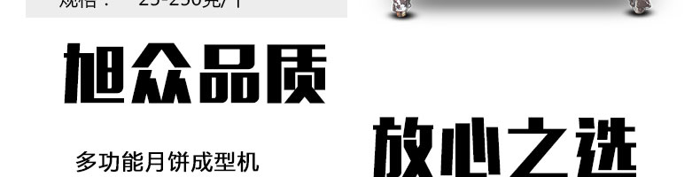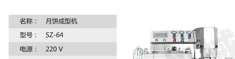 名稱SZ-64月餅自動(dòng)成型機(jī) 電源220V 功率0.4kw 產(chǎn)量40-60個(gè)/分鐘 尺寸1760*530*1045mm 重量200kg 規(guī)格25-250克/個(gè) 其他