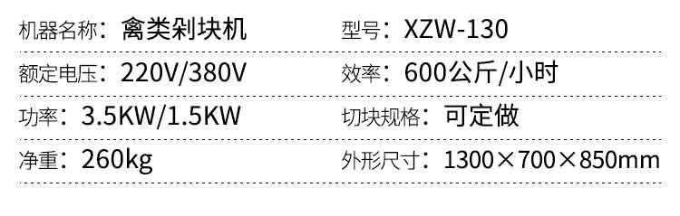 名稱XZW-130剁塊機(jī) 電源220/380V 功率3.5kw/1.5kw 產(chǎn)量600斤/小時(shí) 尺寸1300×700×850mm 重量260kg 規(guī)格 其他